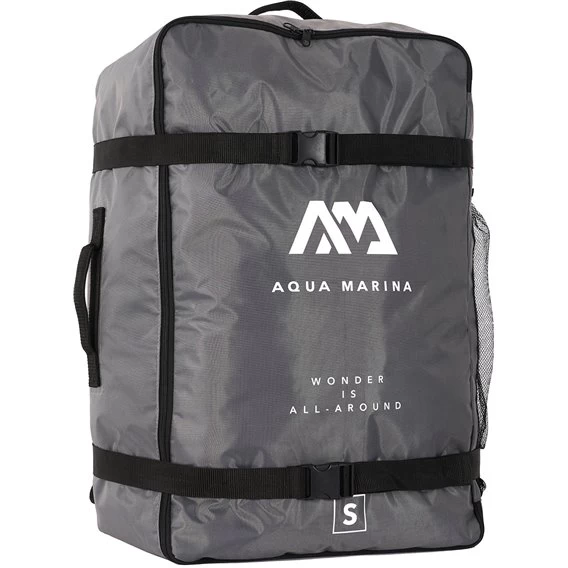 Transport- und Aufbewahrungstasche für alle Aqua Marina 1 Personen Kajaks und Kanus. Die Tasche hat für einen einfachen Transport gepolsterte Schultergurte und zwei Kompressionsgurte. Außerdem hat die Tasche ein Aufbewahrungsnetz auf der rechten Seite, in dem Zubehör verstaut werden kann.
