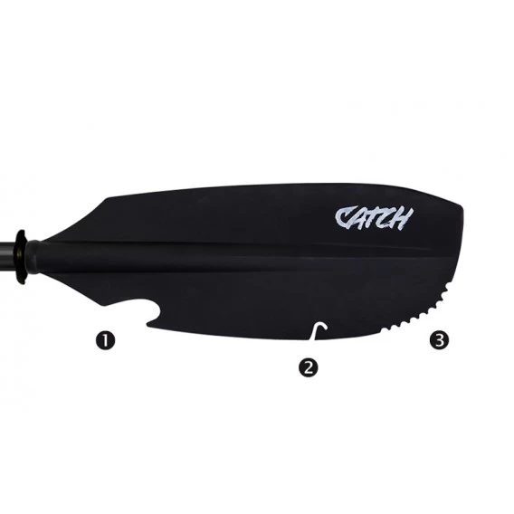 2: Einschnitt für die Angelschnur – dient zur Freimachung der eingeklemmten Angelschnur aus dem Boden oder Ästen.
